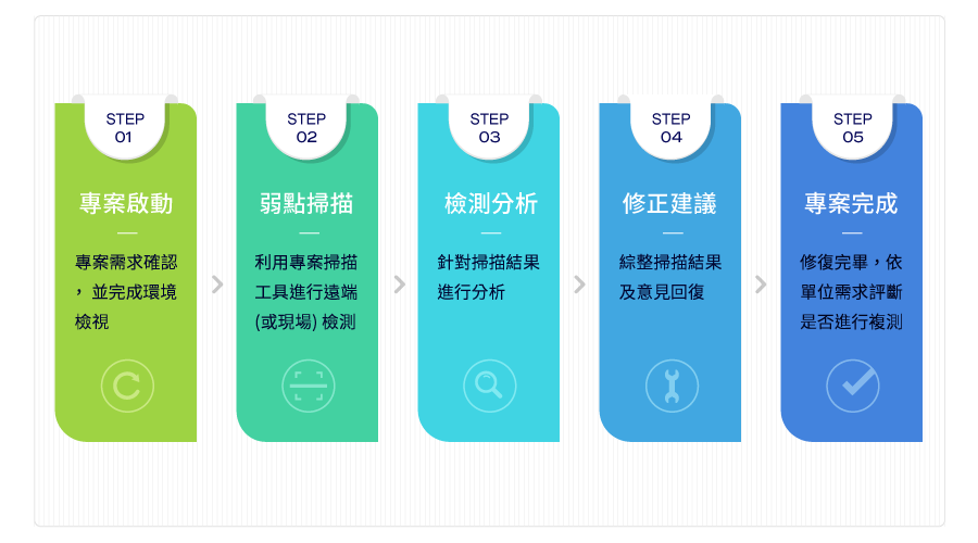 把握黃金時間,讓企業在第一時間就能快速阻擋駭客入侵,使用宏遠電訊弱點掃描服務,將可有效防禦這類攻擊,讓主機系統及服務網站達到最佳的資安防護,宏遠電訊提供的弱點掃描服務是經由模擬駭客攻擊方式,以非侵入技術檢測企業主機系統、網頁網站是否具有安全性,透過掃描結果提供完整的弱點分析報告,企業主及管理人員則可依據所提供的報告進行修補,用以強化主機系統及網頁內容的安全,進而提升主機網站的資安強度,大幅降低入侵的風險。