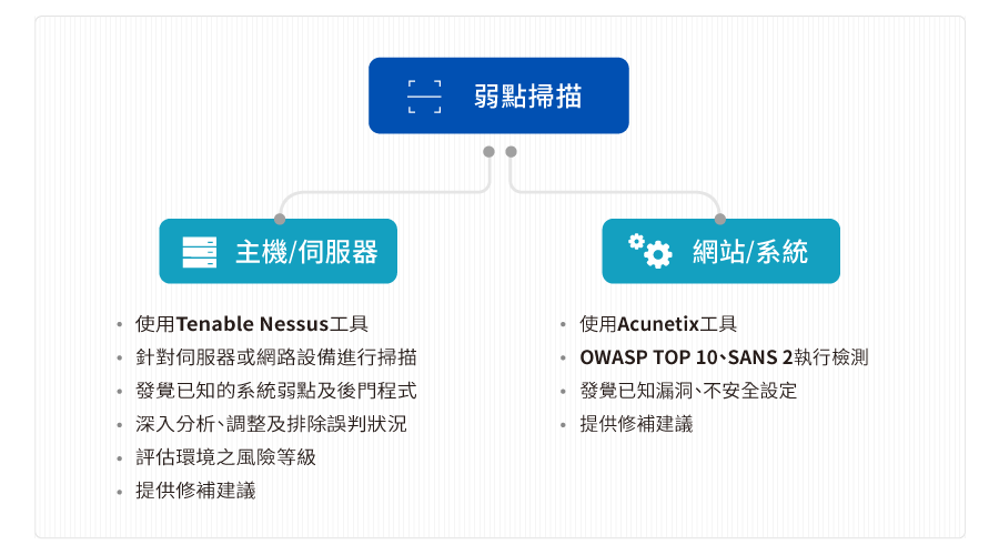 隨著網際網路快速發展所帶來的普及化,各個企業都提供了企業專屬網頁網站的資訊服務,而後端主機系統的安全管理卻常常是被企業主所忽略的一個環節。企業往往會因為主機系統的漏洞或管理人員的人為疏失,讓駭客有機會趁虛而入。因此必須定時對主機系統、服務網站進行弱點掃描,隨時監控系統及網站的安全,才能真正有效達到資訊安全保護的目的。